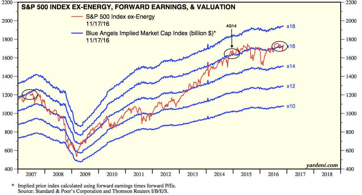 Where critics have a valid point is valuation. Even excluding the troubled energy sector, valuations were rich at the end of 2014 and remain so today. These valuations are at the same level as in mid-2007 when the prior bull market ended (from Yardeni).