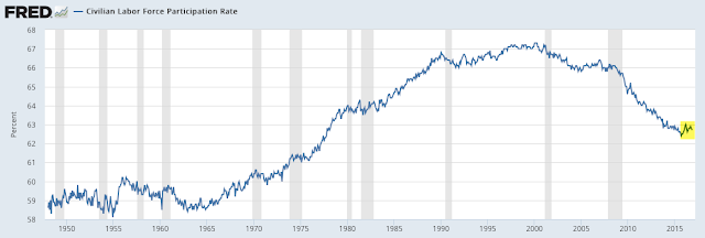 The labor force participation rate (the percentage of the population over 16 that is either working or looking for work) has been falling. This has little to do with the current recovery; the participation rate has been falling for more than 16 years. Participation is falling as baby boomers retire, exactly as participation started to rise in the mid-1960s as this group entered the workforce. Another driver is women, whose participation rate increased from about 30% in the 1950s to a peak of 60% in 1999.
