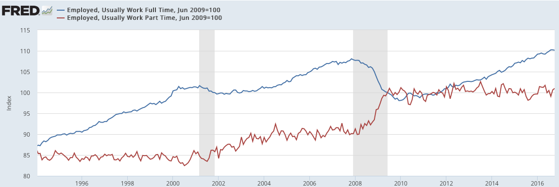 Employment has been been driven by full-time jobs, which are at a new all-time high (blue line), not part-time jobs (red line).