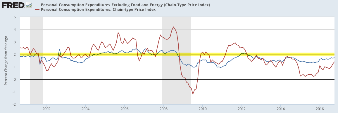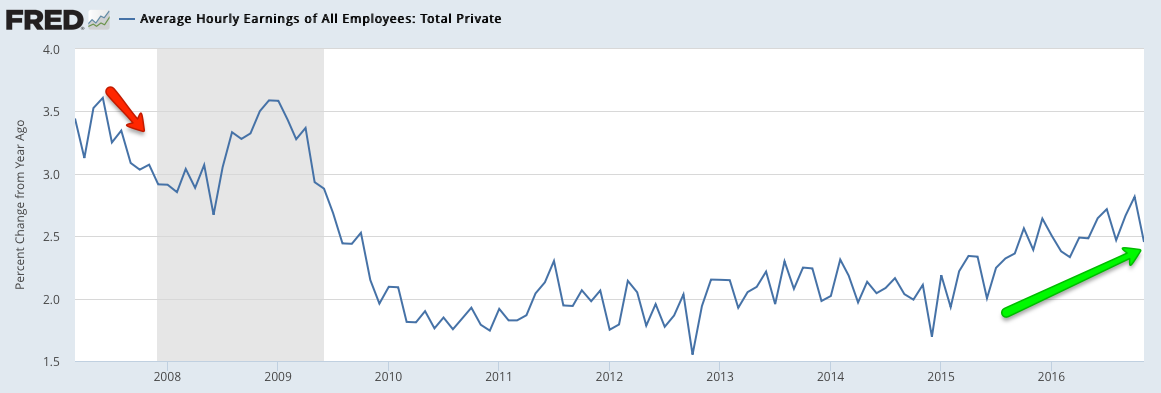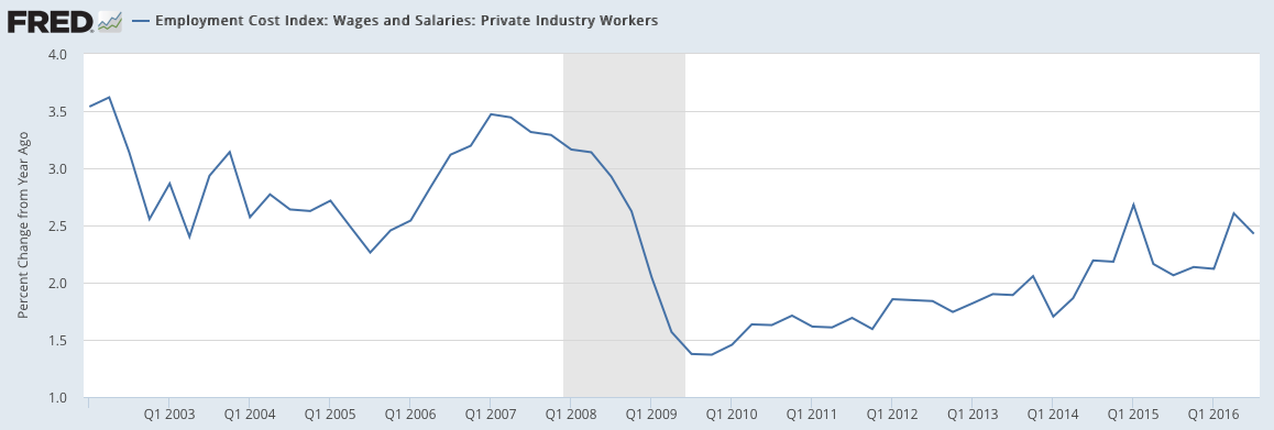 Similarly, 3Q16 employment cost index shows compensation growth was 2.4% yoy. This is near the highest growth rate since the recession.