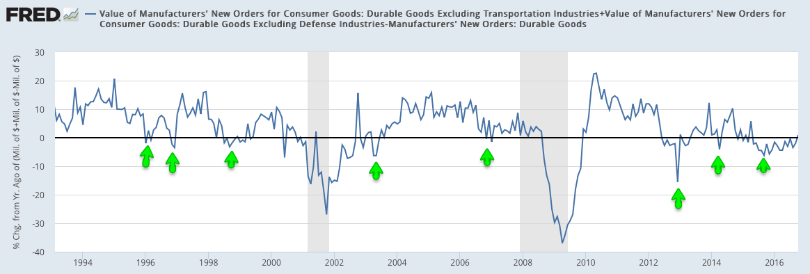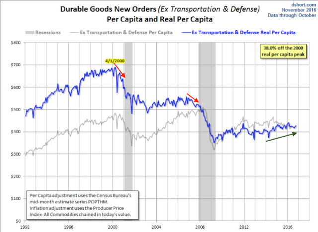 - Core durable goods growth rose 1.0% yoy in October. It was weak during the winter of 2015 and it has not rebounded since.