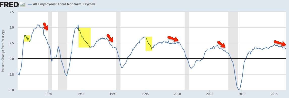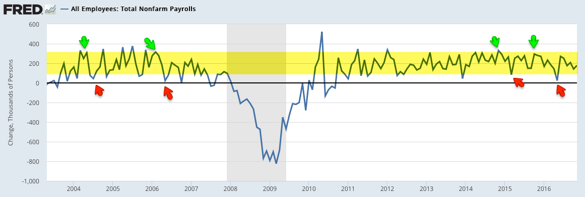Monthly NFP prints are normally volatile. Since 2004, NFP prints near 300,000 have been followed by ones near or under 100,000. That has been a pattern during every bull market; NFP was negative in 1993, 1995, 1996 and 1997. The low prints of 84,000 in March 2015 and 24,000 in May 2016 fit the historical pattern. This is normal, not unusual or unexpected.