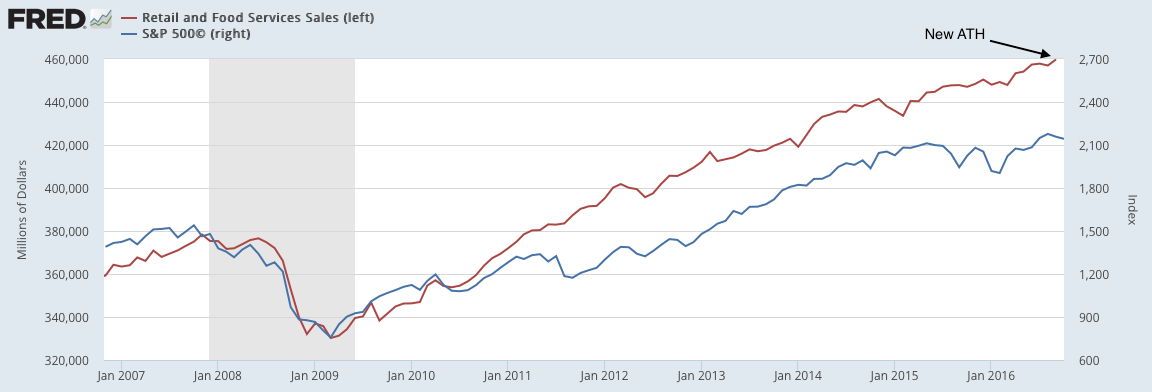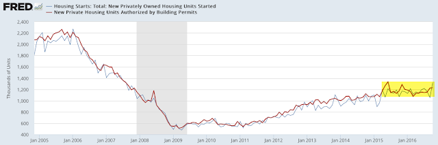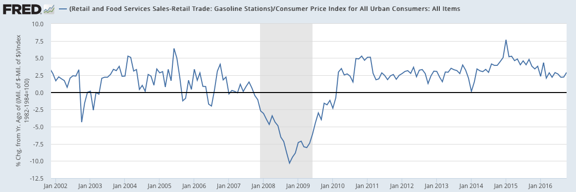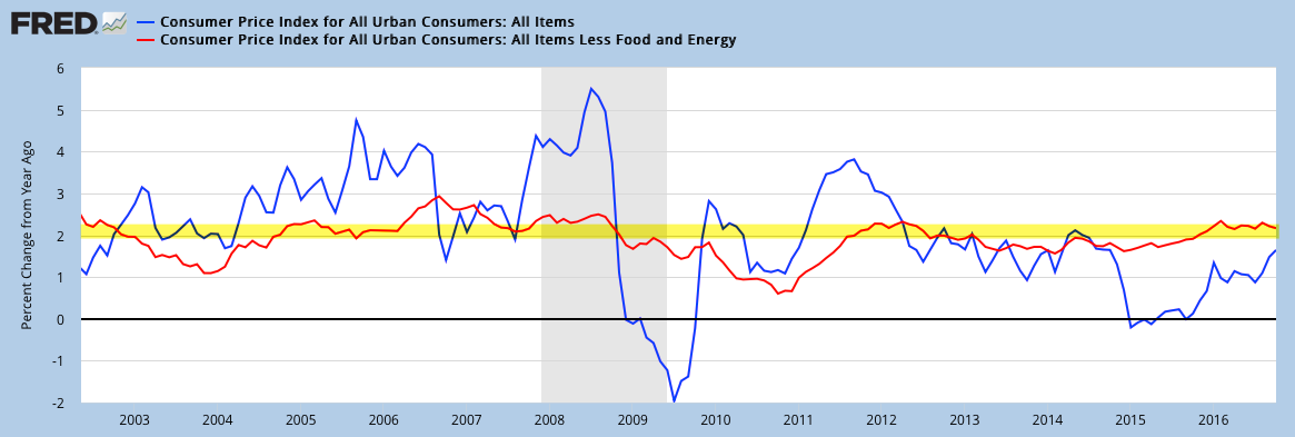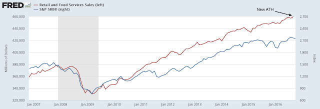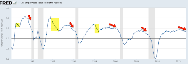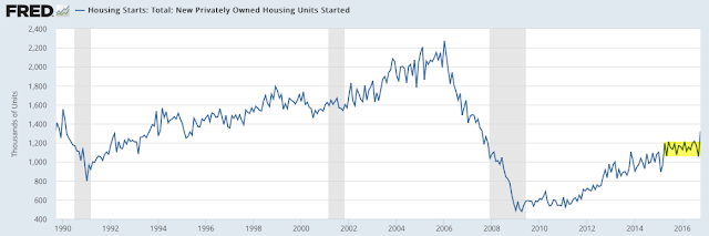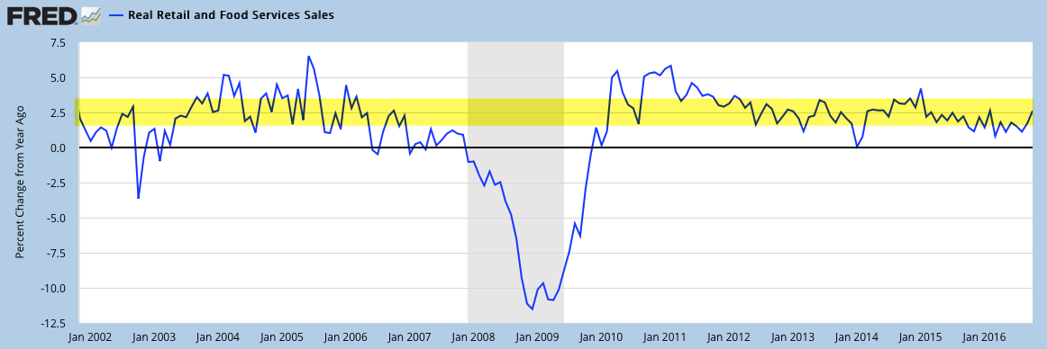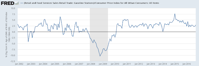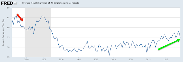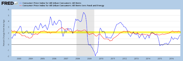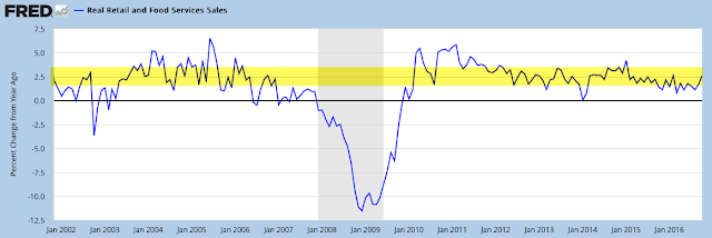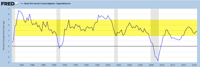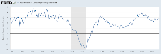 Similarly, the "real personal consumption expenditures" component of GDP (defined), the component which accounts for about 70% of GDP, grew at 2.7% yoy in 3Q16. The last eight quarters have seen the highest persistent growth rate since 2006. This is approaching the 3-5% that was common in prior expansionary periods after 1980.