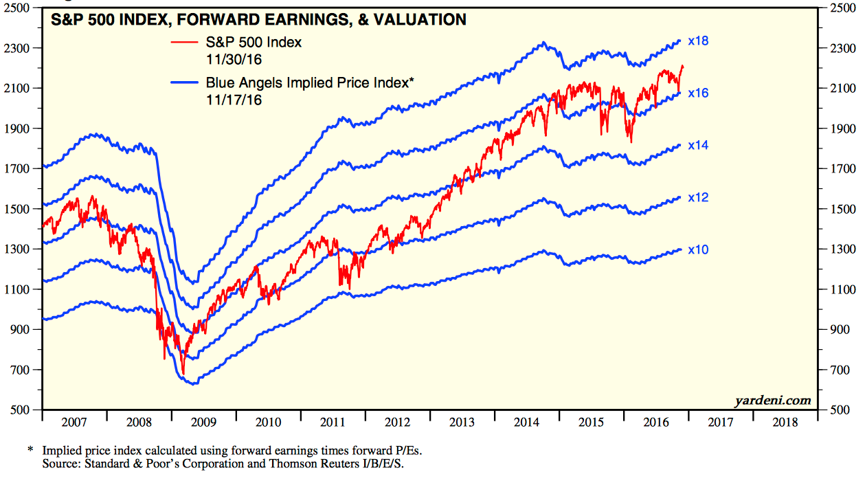With valuations now well above average, the current pace of growth is likely to be the limiting factor for equity appreciation. This is important, as the consensus expects earnings to grow about 1% in 2016 (chart from Yardeni).