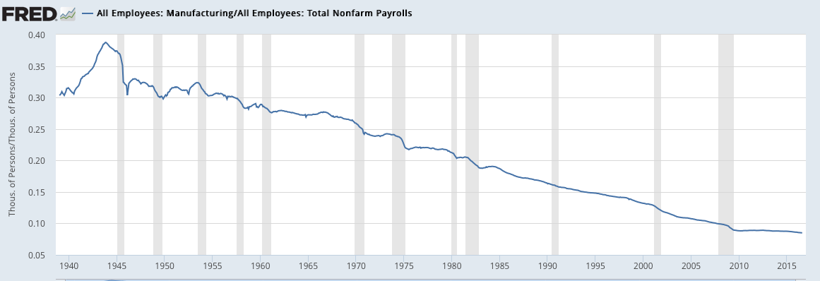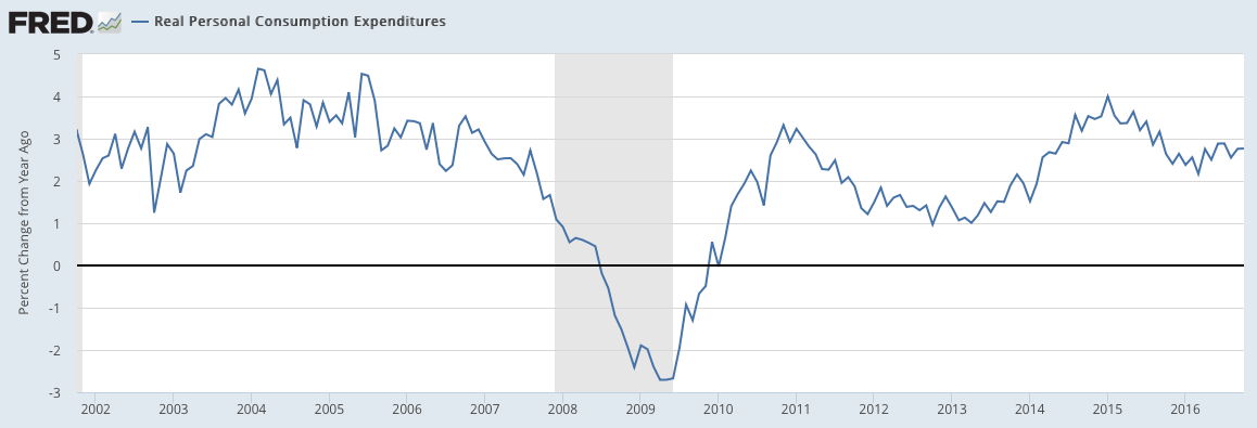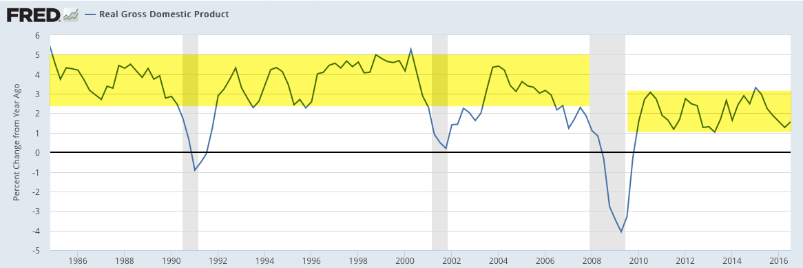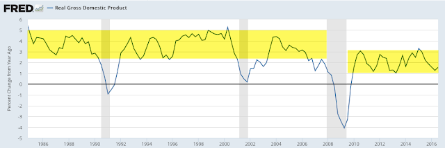 Real (inflation adjusted) GDP growth through 3Q16 was 1.6% yoy. 2.5-5% was common during prior expansionary periods since 1980.