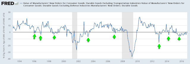 Core durable goods orders (excluding military, so that it measures consumption, and transportation, which is highly volatile) rose 1.0% yoy (nominal) in October. Weakness in durable goods has not been a useful predictor of broader economic weakness in the past (arrows).