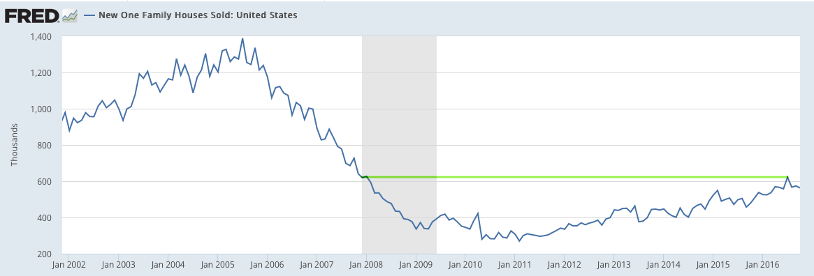 First, new houses sold was 563,000 in October, slightly lower than July's sales which were at the highest level in the past 9 years. Growth was 18% over the past year after rising 1% yoy in October 2015.