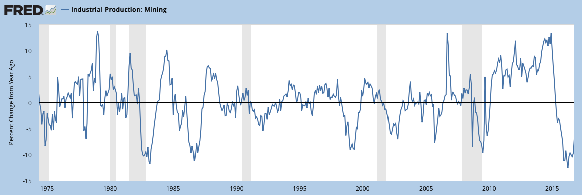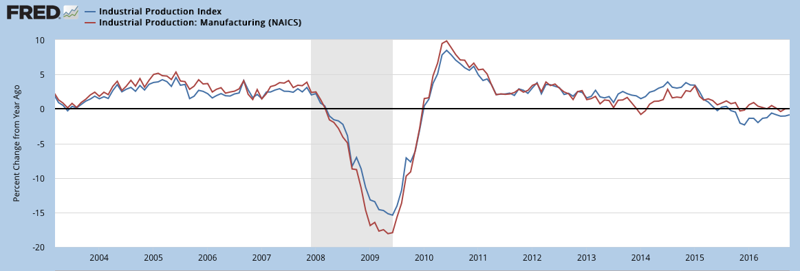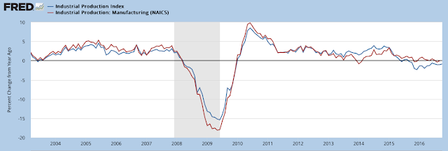 Industrial production growth fell -1.0% in October. The more important manufacturing component (excluding mining and oil/gas extraction; red line) was flat yoy. It's a volatile series: manufacturing growth was lower at points in both 2013 and 2014 before rebounding strongly.