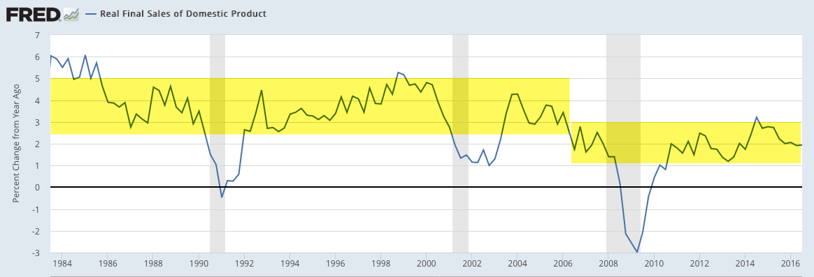 Stripping out the changes in GDP due to inventory produces "real final sales". This is a better measure of consumption growth than total GDP. In 3Q16, this grew 1.9% yoy. A sustained break above 2.5% would be noteworthy.