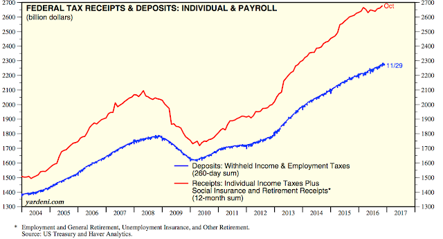 For those who doubt the accuracy of the BLS employment data, federal tax receipts have also been rising to a new high (red line), a sign of better employment and wages (from Yardeni).