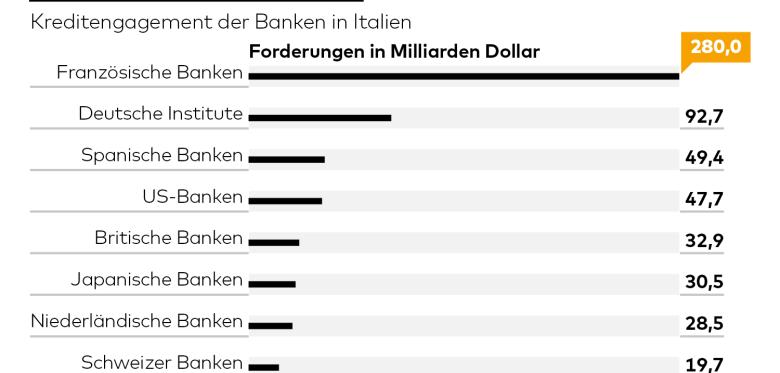 A total of 610 billion dollars converted 550 billion euros that have banks borrowed Italy worldwide . French casualties in particular have to shake. After all, they are carrying the list of creditors at 250 billion euros. German institutes have nearly 84 billion euros in the fire, almost as much as the Spanish and US credit institutions.