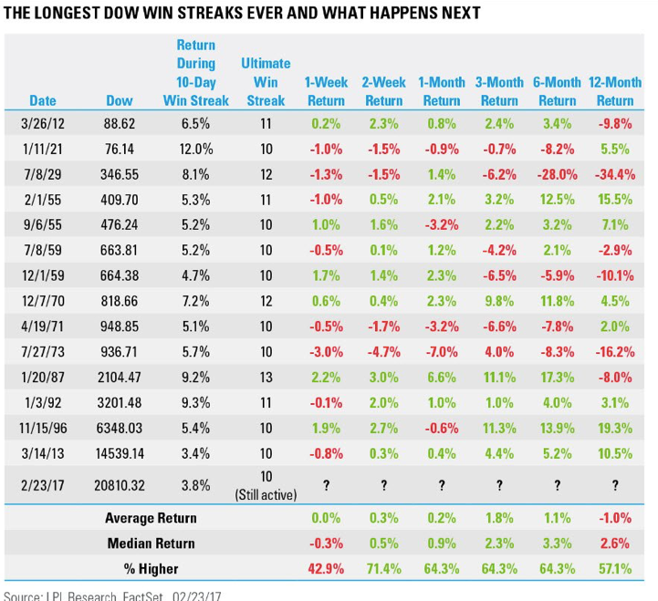 One of the other long streaks ended in January 1987. In October of that year, the SPX crashed 30%. It was devastating, but note that between the end of the streak in January and the start of the crash in October, SPX rose a further 30%. In other words, the upward momentum lasted another 9 months.
