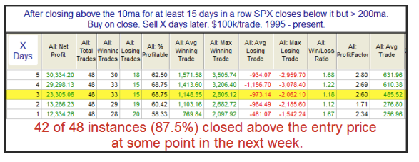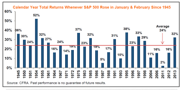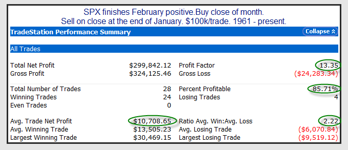 In a related study that examines positive closes in February, the next 11 months saw net gains 86% of the time (24 of 28 years since 1961). The profit factor (gains divided by losses) is 13, which is very attractive (from Rob Hanna).