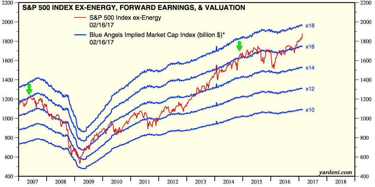 It's true that current market valuations are unattractive, a headwind we have raised when discussing earnings (read further here). But keep in mind that overvaluation has been a very bad mechanism for market timing. The correlation between valuations and forward one-year returns is nearly zero. Investors rightly indicated that the SPX was fully valued in late 2014; since then, it has gained another 25% (from Yardeni).