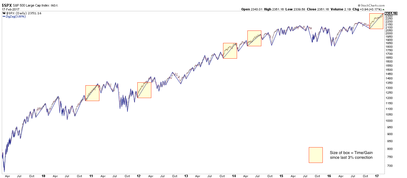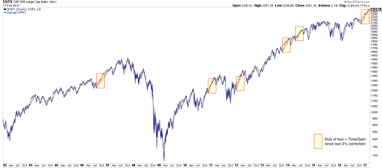 First, SPX has now gone 76 days since the last 3% drawdown ended on November 4, right before the US election. That is the longest streak since July 2006 to February 2007, when the SPX went 150 days without a 3% drawdown. The chart below shows the duration and magnitude of the current rally relative to other long streaks in the past 14 years (yellow highlighting equals the current rally). Enlarge any chart by clicking on it.