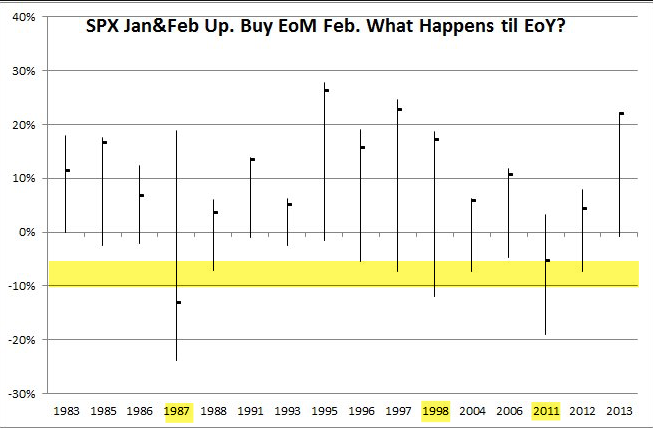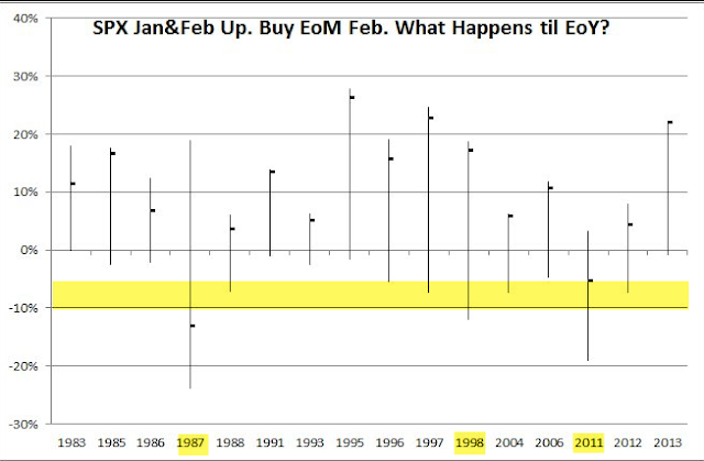 What happened if you bought the close on the last day of February and held until year-end? In most cases (14 of 16, or 88%), SPX closed higher, often by more than 10%. But in half the cases, there was an intra-year drawdown of at least 5% and more than 10% in three memorable years (1987, 1998 and 2011; from @Minion_of_Gozer).