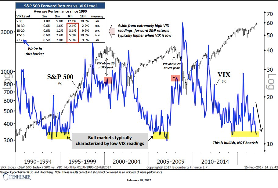 The fourth study with longer term implications relates to volatility. Much has been made of the persistently low level of the Vix. The three most recent bull markets have each been characterized by a persistently low Vix. Historical instances are severely limited, but a low Vix has been a positive sign for the SPX. The market did not peak in either 2000 or 2007 until Vix had climbed, over the course of years, to more than 25. Since 1990, when the Vix has been below 12, SPX has returned 5% and 10% over the next 6 and 12 months, respectively (from Ari Wald).