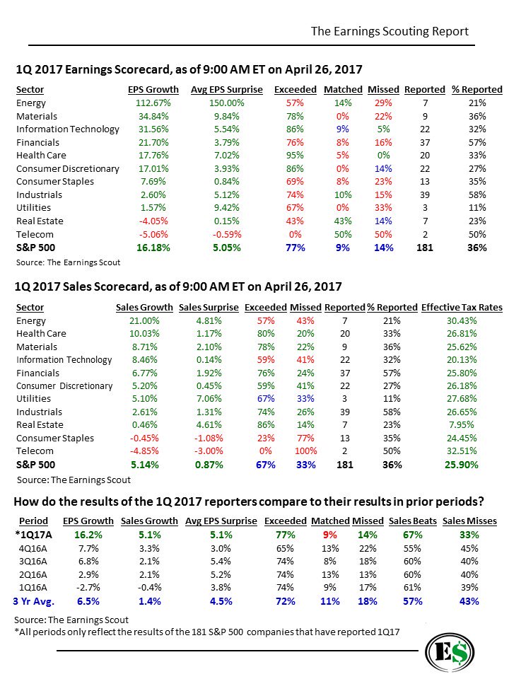 Earnings have been coming in strong, led by a 112% increase in Energy Sector earnings and, overall, with 20% of the companies reporting, we're 16.2% ahead of Q1 '16, though that was a terrible quarter that was down 2.7% from 2015.  Of course, the S&P was at 1,850 in Q1 last year and now it's at 2,388, which is up 29%, which is kind of a lot to pay for 16% better earnings which is why, despite all the "great" news, we're still leaning short on the market.