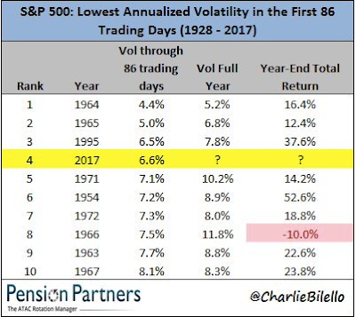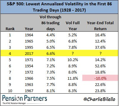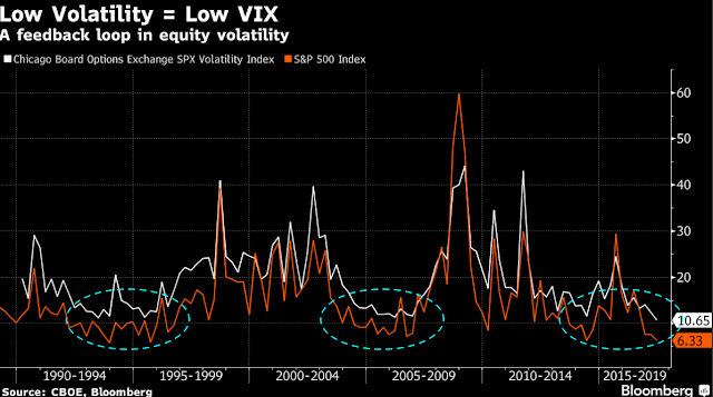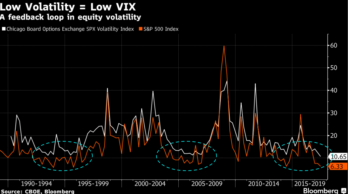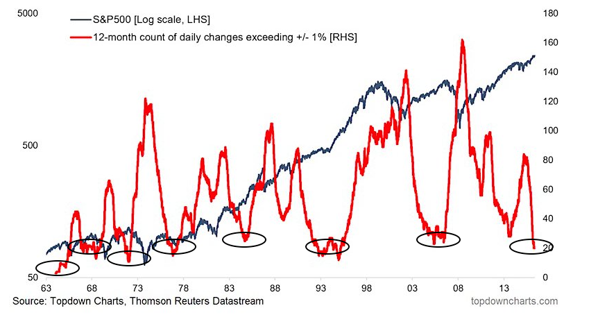 The shift towards index-based investing is being associated with the low volatility of the stock market. That seems unlikely. To begin with, a period of low volatility, measured any number of ways, has been a feature of every bull market for at least 50 years (from Bloomberg, Callum Thomas and Charlie Bilello, respectively).