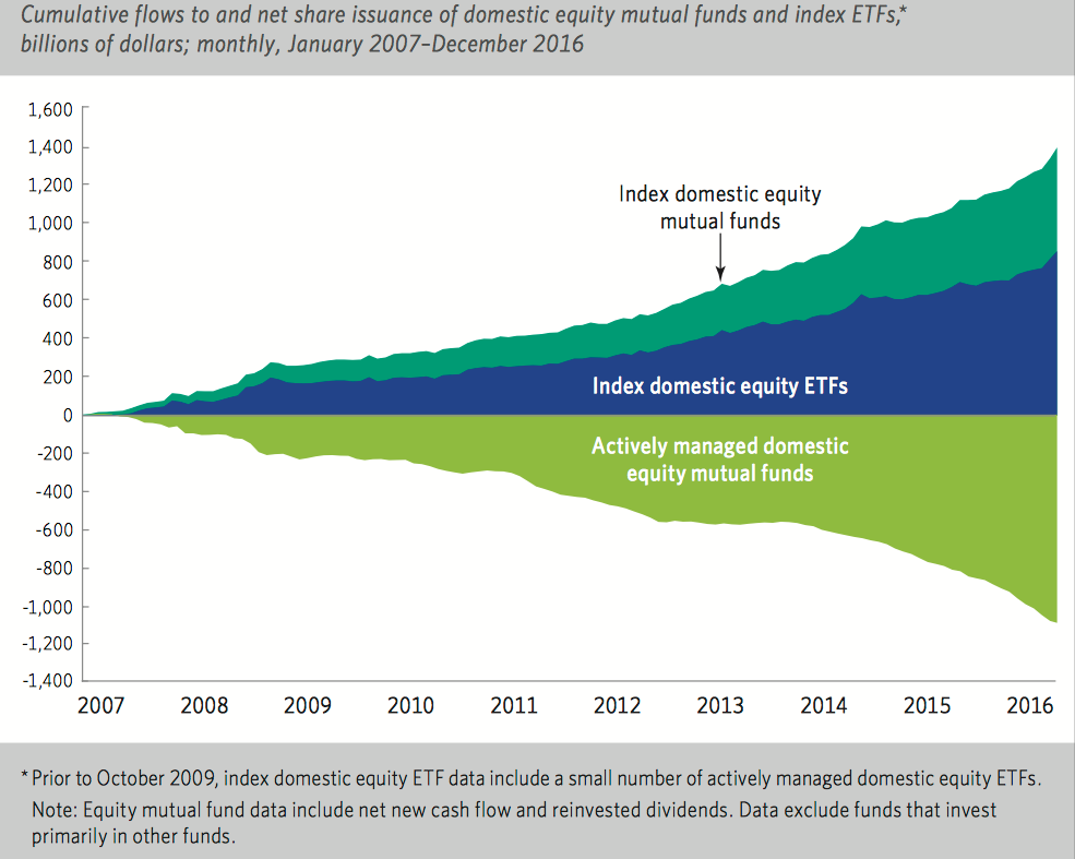 It's clearly true that there is a shift to index-based investing. Over the past 10 years, approximately $1.4 trillion has flowed into domestic equity index mutual funds and ETFs. About $1 trillion of this money has come out of actively managed mutual funds (from ICI; full report can be found here).