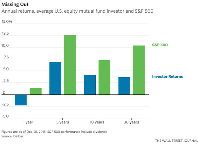 That is not so surprising, given the lower cost of index funds and their consistently better performance (green bars) relative to actively managed funds (blue bars; from the WSJ).