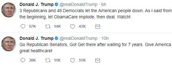 Speaking of politics:  32 Million thank yous to Republican Senators Lisa Mukowski, Susan Collins and yes, even John McCain for saving health care for 32M Americans (for now).  They voted against the Obamacare repeal last night and there were gasps on the Senate floor when John McCain, who Trump just called a real hero for voting to allow debate on the bill, voted against the actual bill – even criticizing the partisan process by which McConnell and company were attempting to ram the bill through on.