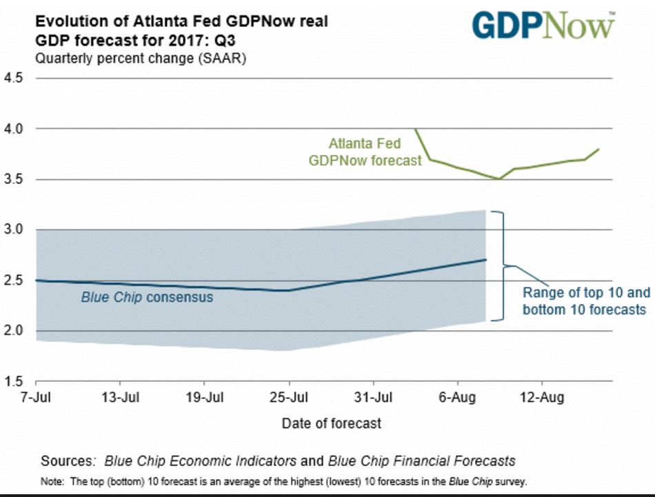 As you can see from the Fed's GDPNow forecast, it's raging ahead of the forecasts of our leading Economorons by a wide margin. Usually, I bet against the Economorons but the Fed is full of them too so it's a toss-up as to who is likely to be more wrong but we have a short bet on the Dow Futures (/YM) at 21,900 that says it's the Fed.