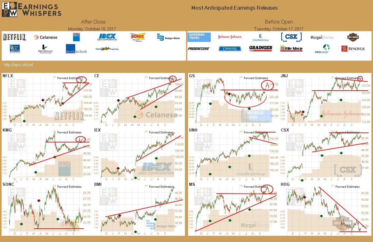 Meanwhile, it's earnings season and yesterday we got a beat from Schwab (SCHW) and SONC (SONC) although the latter blamed the hurricanes for any shortfalls.  KMG (KMG) and Netflix (NFLX) missed but Netflix was immediately forgiven by rabid fans, who are happily paying the 10% rate hike which will, hopefully, compensate for their profligate spending.  NFLX did add 4.5M new subscribers and, at $13/month, that's $702M/yr in new revenues added in just one quarter – not bad!  Unfortunately, they have also increased content spending by $1Bn/yr ($8Bn now) – so we'll see how things go for them but the bottom line is they burned $465M in cash last Q – not good.