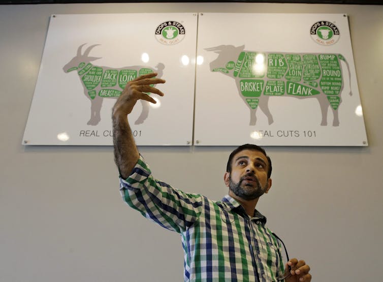 Gul Muhammad at his Chops and Steaks butcher shop in North Brunswick, N.J., discusses halal meat orders for customers in 2015. Shops like his must be vigilant ensure the meat is verified halal — a task blockchain technology could aid. (AP Photo/Mel Evans)