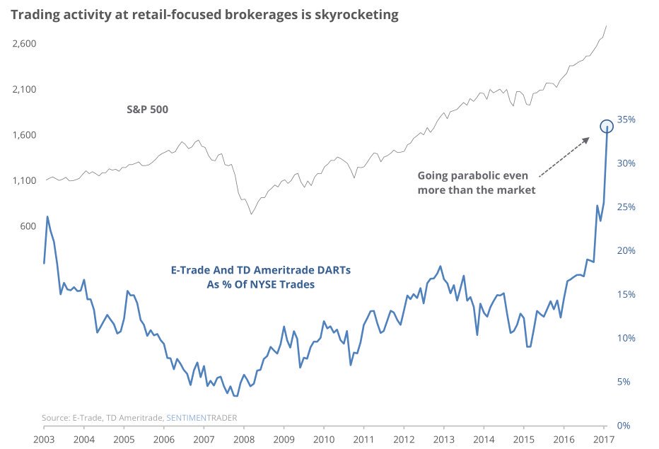 Global credit rating agencies S&P and Moody’s both downgraded China’s sovereign credit rating last year, citing worries about its rapid build-up in debt after years of credit-fueled stimulus used to meet official economic growth targets yet investors could care less and keep buying China, Japan, Europe, the US as if everyting is fine and only going to get better, spurred on by the Banksters, who need the retailers to come in and take these tremendous bags off their hands (see: "Earnings have been ‘unambiguously positive,’ and it’s going to get even better, says JPMorgan"). Those are the kind of superlatives you tend to get ahead of a correction and just look at the little suckers pouring in at the top: