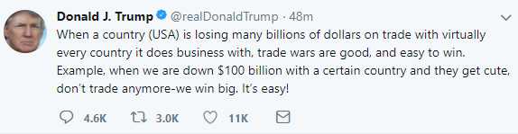 Those insane comments I was speaking about were his 5:50 am tweet (mine was 6:53) saying (and I WISH I were making this up "trade wars are good" and, oops, that's out of context because you could argue that's not insane, just stupid but he added "and easy to win" to push his comment firmly into the insane camp – as anyone who has taken an economics class since 1930 can tell you! Or, as I summarized: