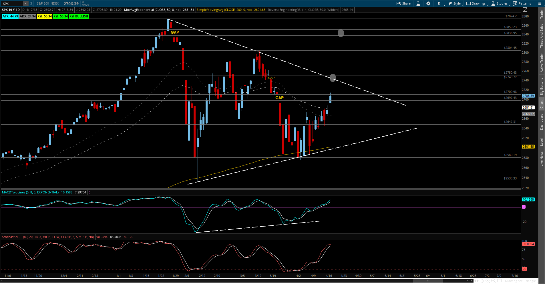 As you can see from the chart (click to enlarge) we're still making one of those triangle squeezy thingy pattens but the top of the down wedge is still at our 2,740 line and it will be three more weeks of this nonsense (while earnings pour in) until it resolves itself but, with the nose of the triangle lower than where we are now (2,717) – the odds favor the short bet on /ES Futures.