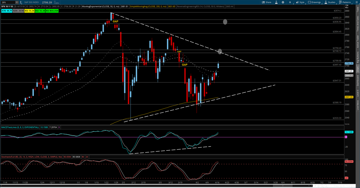 As you can see from the chart (click to enlarge) we're still making one of those triangle squeezy thingy pattens but the top of the down wedge is still at our 2,740 line and it will be three more weeks of this nonsense (while earnings pour in) until it resolves itself but, with the nose of the triangle lower than where we are now (2,717) – the odds favor the short bet on /ES Futures.