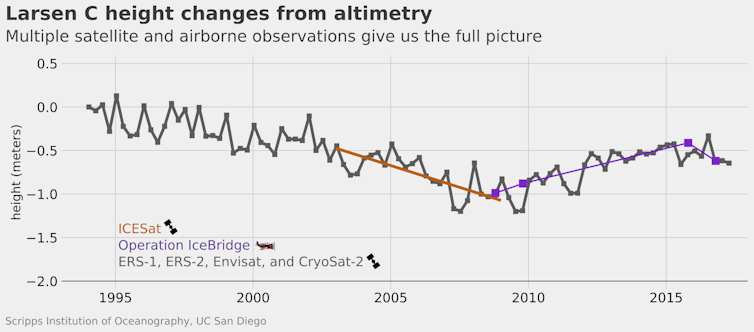 Height changes observed over Larsen C Ice Shelf from Four European Space Agency satellites, one NASA satellite and an extensive airborne survey from NASA’s Operation IceBridge. Helen Fricker, CC BY-ND