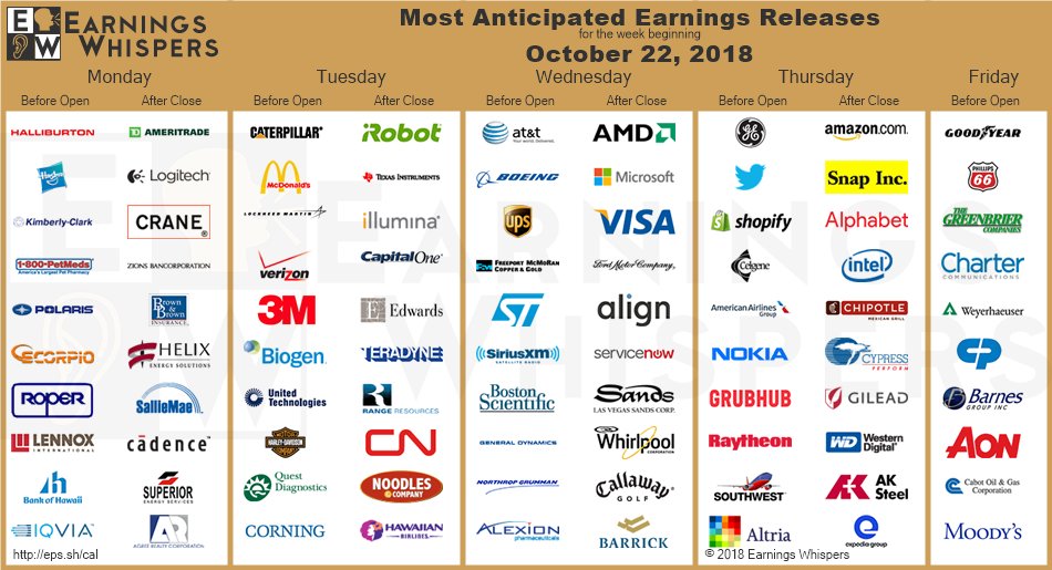We have a busy data week ahead with the Fed's Beige Book out Wednesday, Durable Goods Thursday and 3rd Quarter GDP on Friday and estimates have been heading lower and lower with the usually optimistic Atlanta Fed down at 3.9% from 4.9% forecast last quarter.  Q2 was 4.2% so anything under 4% is slowing but under 3.5% will be seen as a very negative sign.  Along with data, Earnings Season is heating up with 100 (20%) of the S&P 500 about to drop their reports: