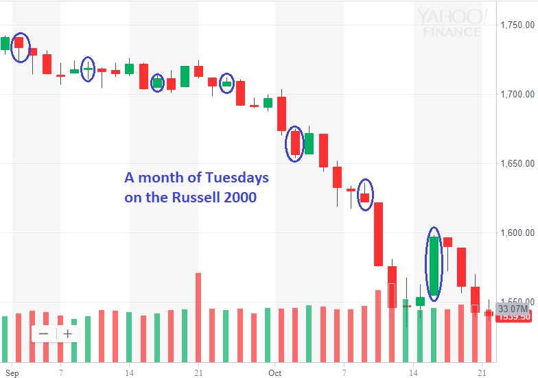 As you know, we love a good sell-off because we're very well-hedged but now we seem to be breaking even lower and we'll have to look at improving our hedges – just in case.  We are significantly lower than 10/9's Tumblin' Tuesday and 10/2 was "Tuesday – Trouble at 1,700 for the Russell" and we're miles from that now as we are almost down to 1,500 and Sept 25th our Morning Report was: "Toppy Tuesday – Markets Bounce Back Ahead of the Fed" after 9/18's "Tariffic Tuesday – Markets Ignore Another $200Bn Drag on Global Trade".  Oh, and last Tuesday was: "Tempting Tuesday – Nothing has Changed but Markets Move Higher.