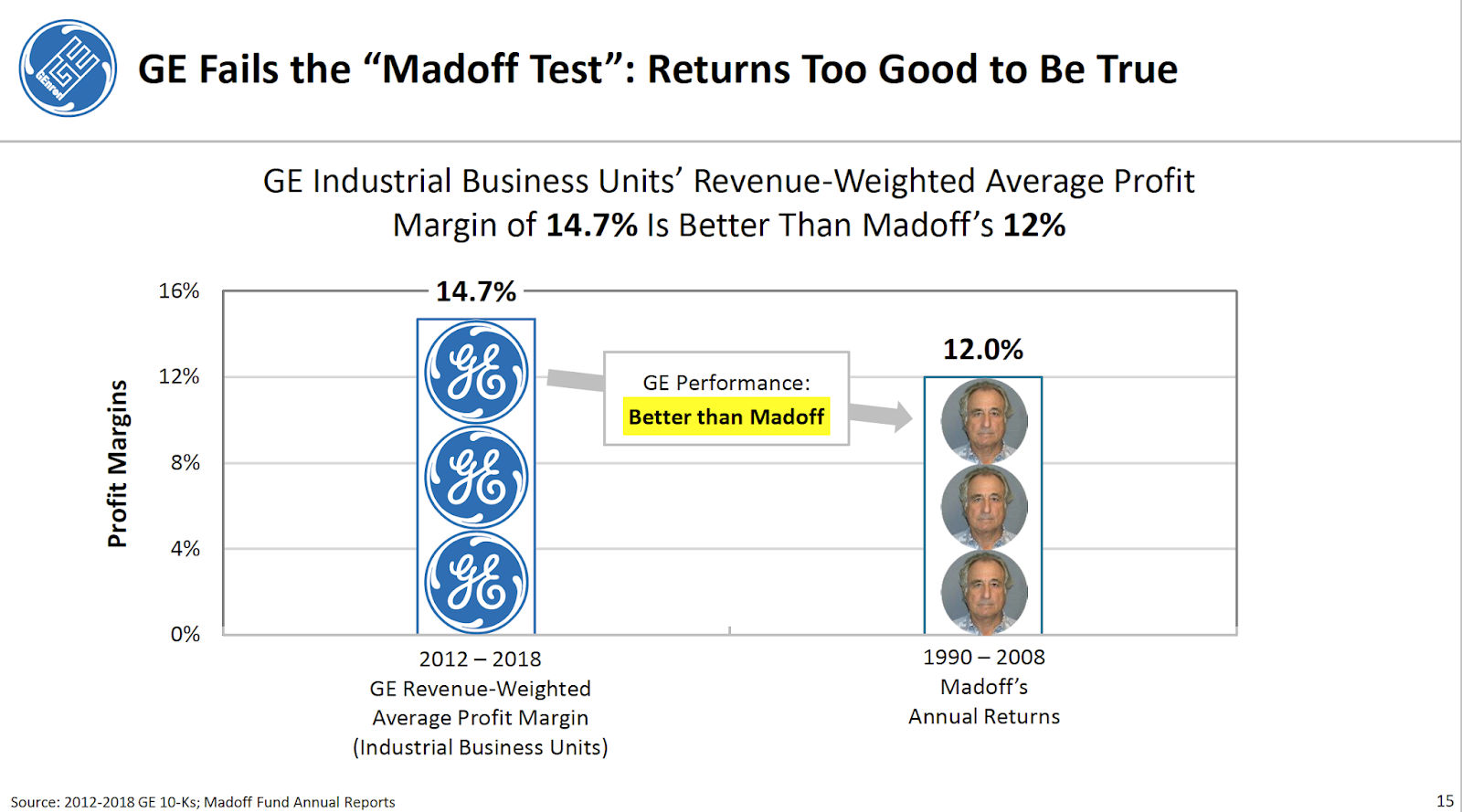 But outside Long Term Care is where the report gets really silly. Here is a slide comparing GE's industrial margins to Madoff returns: