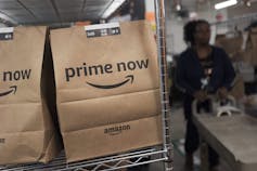 Prime Now customer orders are ready for delivery at the Amazon warehouse in New York. (AP Photo/Mark Lennihan)