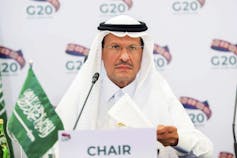 Prince Abdulaziz bin Salman Al-Saud, Saudi Arabia’s energy minister, leads a recent virtual summit of the G20 energy ministers at his office in Riyadh, Saudi Arabia. (Saudi Energy Ministry via AP)