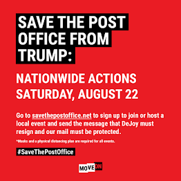 Move On has announced a national day of protest, Saturday, August 22nd, at your local post office at 11 am (local time). Sign up at savethepostoffice.net and follow #SaveThePostOffice for future updates.