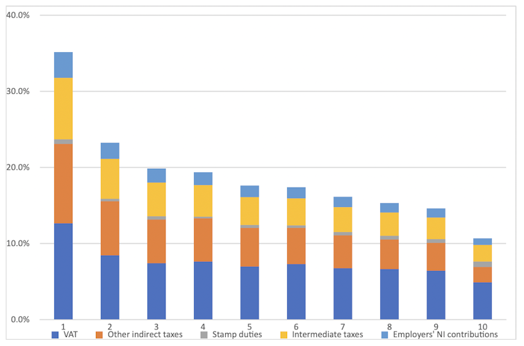 When the same ONS data combined employers’ NI with VAT, stamp duty and several other indirect taxes, the disproportionate effect on the poorest households remained substantial: they paid 35% of their income on these taxes as opposed to 10% for the wealthiest households (see the chart below, which breaks down households into ten levels of income, from 1 being the poorest to 10 being the wealthiest).