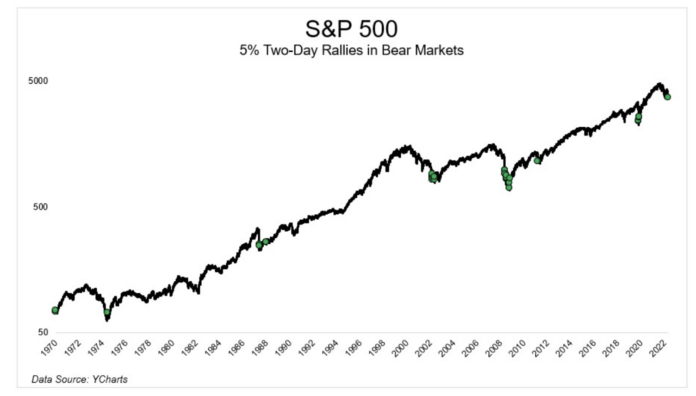 Stocks are currently in the midst of their best two-day return since April 2020. I wanted to take a look at all the 5% two-day returns while the S&P 500 was in a 20% drawdown and see if there was any signal there. It’s hardly a perfect track record. October 2008 for example was not the low, for example. But it’s not too shabby either. Historically these types of moves didn’t necessarily happen at the low, but around it.