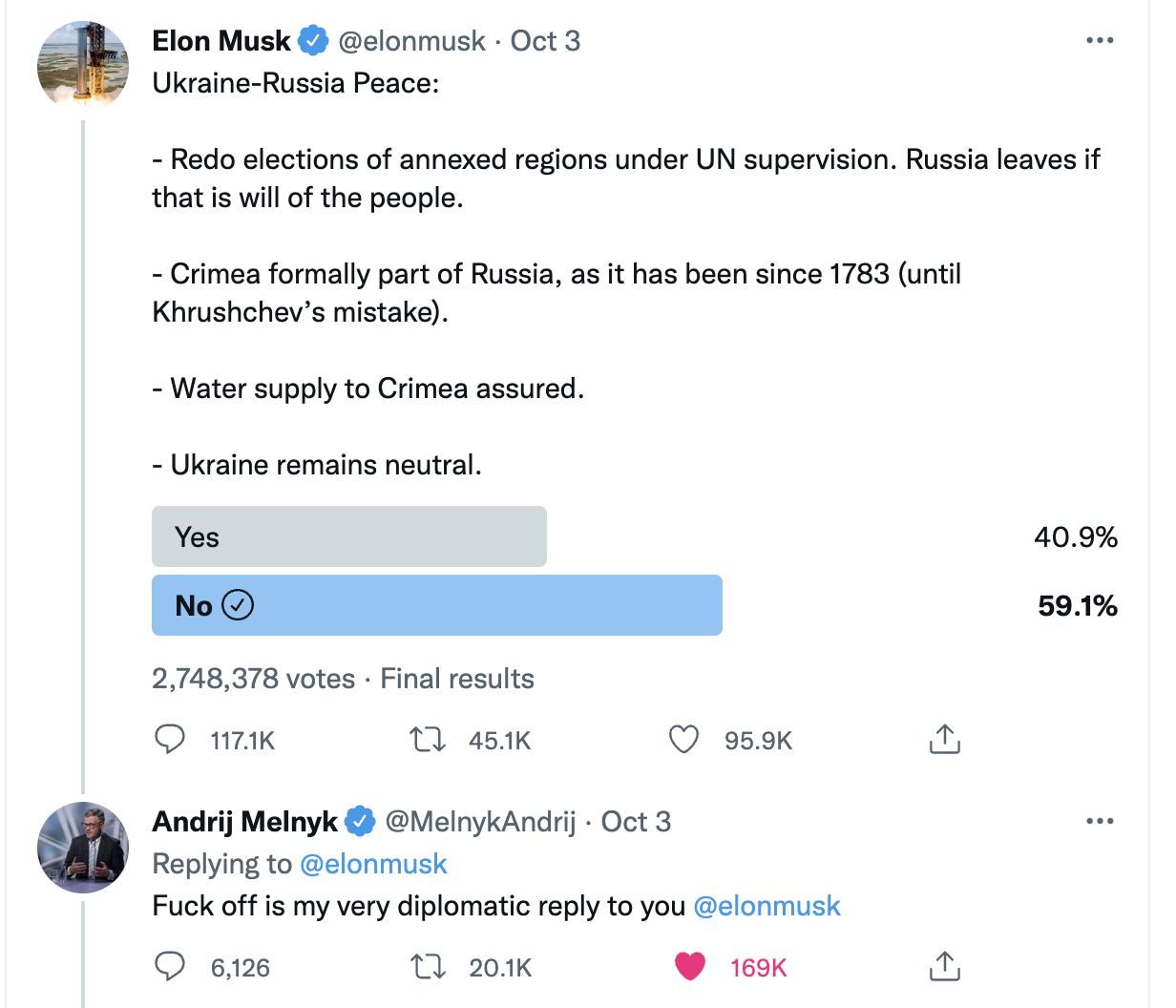 Though his myriad business complications would seemingly present more than enough distraction, Musk found the opportunity to don his diplomat’s hat earlier this week. On Monday, he Tweeted a peace plan for the Ukraine-Russia war that suggested that the invaders be allowed to maintain control of the Crimean Peninsula, and that Ukraine abandon its bid to join NATO and pledge to maintain a neutral status in all future conflicts. “This is highly likely to be the outcome in the end – just a question of how many die before then,” he said.
