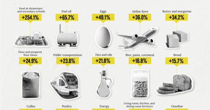 HomeMarkets Markets U.S. Inflation: How Much Have Prices Increased? By news January 1, 2023 0 158 FacebookTwitterPinterestWhatsApp Inflation has been top of mind over the last year, looming over every aspect of the economy. But how has inflation actually impacted the prices of …This post was originally published on this site Share FacebookTwitterPinterestWhatsApp Subscribe Login Notify of new follow-up comments new replies to my comments Please login to comment 0 Comments Inline Feedbacks View all comments Stay Connected149,537FansLike396,312FollowersFollow2,650SubscribersSubscribe Latest Articles AI Paul Krugman: No, AI Doesn’t Justify Lower Interest Rates Markets Fact Check Thursday – What is Really Going on in the Economy? Health Why is US health care still the most expensive in the world after decades of cost-cutting initiatives? Market News Federal Debt to Hit Record Levels, Budget Office Warns Biotech The FDA Refuses To Review Moderna’s Flu Vaccine Markets Will We Hold It Wednesday? Nasdaq 25,000 Edition AI Data centers are scrambling to power the AI boom with natural gas AI America Isn’t Ready for What AI Will Do to Jobs Market News As Jeff Bezos dismantles The Washington Post, 5 regional papers chart a course for survival Markets Tuesday Turmoil: The Matrix Economy – Capital Hegemony and the Infrastructure War Market News Tariffs might seem manageable now – but they’ll quietly squeeze households later Market News Will a ‘Trump slump’ continue to hit US tourism in 2026 − and even keep World Cup fans away? Market News Trump Is a Global ‘Wrecking Ball,’ European Security Experts Say Markets Monday Morning Report: Dow 50K, The Super Bowl Hangover, and The China Syndrome Load more