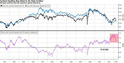 So with recession looming, it’s getting harder to justify cyclicals’ valuations. Share prices have de-rated in the past two weeks but as the chart below shows, cyclicals’ valuations, relative to defensives, can fall another 10% to 20% during downturns.