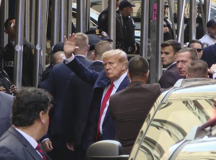 Former President Donald Trump exited his black SUV and waved to supporters as he walked, flanked by Secret Service agents, into a downtown Manhattan courthouse to be arrested on April 4, 2023.