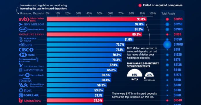 HomeMarkets Markets Ranked: The U.S. Banks With the Most Uninsured Deposits By news April 5, 2023 0 209 FacebookTwitterPinterestWhatsApp Today, there is at least $7 trillion in uninsured bank deposits in America. This dollar value is roughly three times that of Apple’s market …This post was originally published on this site Share FacebookTwitterPinterestWhatsApp Subscribe Login Notify of new follow-up comments new replies to my comments Please login to comment 0 Comments Inline Feedbacks View all comments Stay Connected149,501FansLike396,312FollowersFollow2,650SubscribersSubscribe Latest Articles Markets Get Ready for Zombie Tariffs Hot Items The Supreme Court Just Ruled Trump’s Tariffs Unconstitutional Market News Supreme Court Blocks Tariffs Hours After Trump Bragged They Wouldn’t Markets TGIF Friday – Short Week Not Short Enough in the Fog of War Markets The Worst-Case Future for White-Collar Workers Markets Russia tested NATO’s airspace 18 times in 2025 alone – a 200% surge that signals a dangerous shift AI DHS Opens a Billion-Dollar Tab With Palantir Market News From Iran to Ukraine: The growing risk of conflict Markets Thursday Thoughts – Oil at $66.6 Again – Bad Sign? Market News Japan’s Debt Crisis Is Just the Beginning Biotech FDA’s abrupt flip-flop on Moderna’s mRNA flu shot highlights growing risks to drug-makers of investing in vaccines Market News Fed Minutes Show No Rush to Restart Rate Cuts, and Even Possibility of Hikes Climate Why big oil is not interested in Venezuela Markets Which Way Wednesday? Markets, Media, and Income in the AI Era Load more