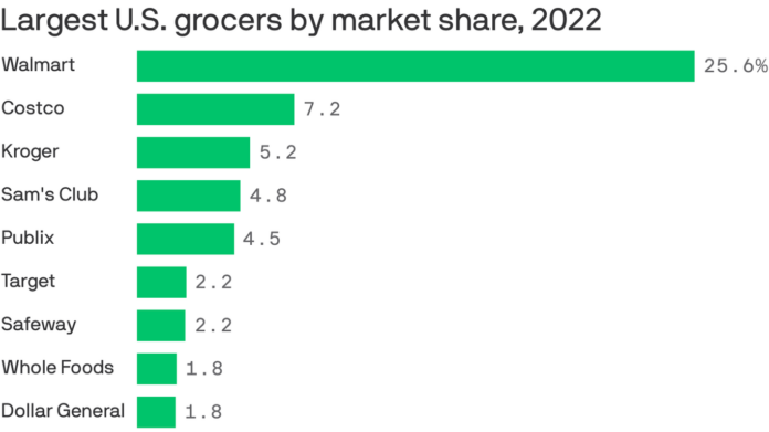HomeMarkets Markets The most popular grocery stores in the U.S. By news April 21, 2023 0 225 FacebookTwitterPinterestWhatsApp Walmart is the most popular grocery store chain nationwide, with 25.2% of the market share as of last year. Costco and Kroger are the second- and …This post was originally published on this site Share FacebookTwitterPinterestWhatsApp Subscribe Login Notify of new follow-up comments new replies to my comments Please login to comment 0 Comments Inline Feedbacks View all comments Stay Connected149,439FansLike396,312FollowersFollow2,650SubscribersSubscribe Latest Articles Markets The ‘Arrogance of Power’ Drives War in Iran Markets The Economy’s Warning Light Is Flashing Yellow Markets ‘Ugly’: Trump’s job market shrinks as oil fears mount Hot Items The Glaring Oversight in the U.S. War Plan Energy The Gulf Countries Can’t Take Much More AI America Cannot Withstand the Economic Shock That’s Coming Markets TGIF – Stop the Week, We Want to get Off – WWIII Edition Markets Justice Department publishes documents with sexual assault allegations against Trump Biotech GLP‑1 drugs may fight addiction across every major substance, according to a study of 600,000 people AI Researchers are combining drones and AI to make removing land mines faster and safer Markets Thursday ThoughtCast – Round Table Report on the “HALO” Rotation (aka: PSW’s “Physical Wall” Strategy) Energy The Real Reason Trump Went to War Hot Items How prepared are the US and its allies for a protracted conflict in Iran? Energy What oil, stocks and bonds are telling us about the Iran conflict and how long it might last Load more