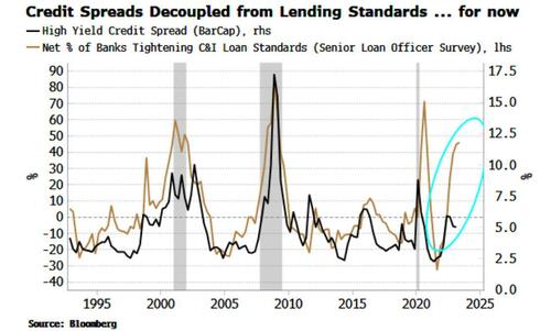 Typically, credit spreads and bank-lending standards track each other closely. The latter’s data is survey based and therefore backwards looking. But banks are likely to take their cues from credit markets – a live, continuously updated indication of the market’s view of credit risk – when deciding on the conditions for the loans they extend.