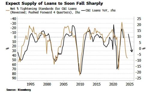 Demand for loans then leads supply of loans. There is about a six-month lead in this relationship (using C&I loans as a proxy for loan growth overall), and the drop in loan demand points to a sharp fall in loans over at least the rest of this year.